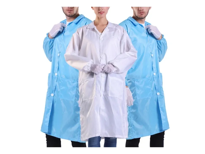 Static-dissipative apparel including coveralls, jackets, aprons, and accessories that safeguard sensitive environments from electrostatic discharge. Ideal for electronics manufacturing, labs, and cleanrooms.